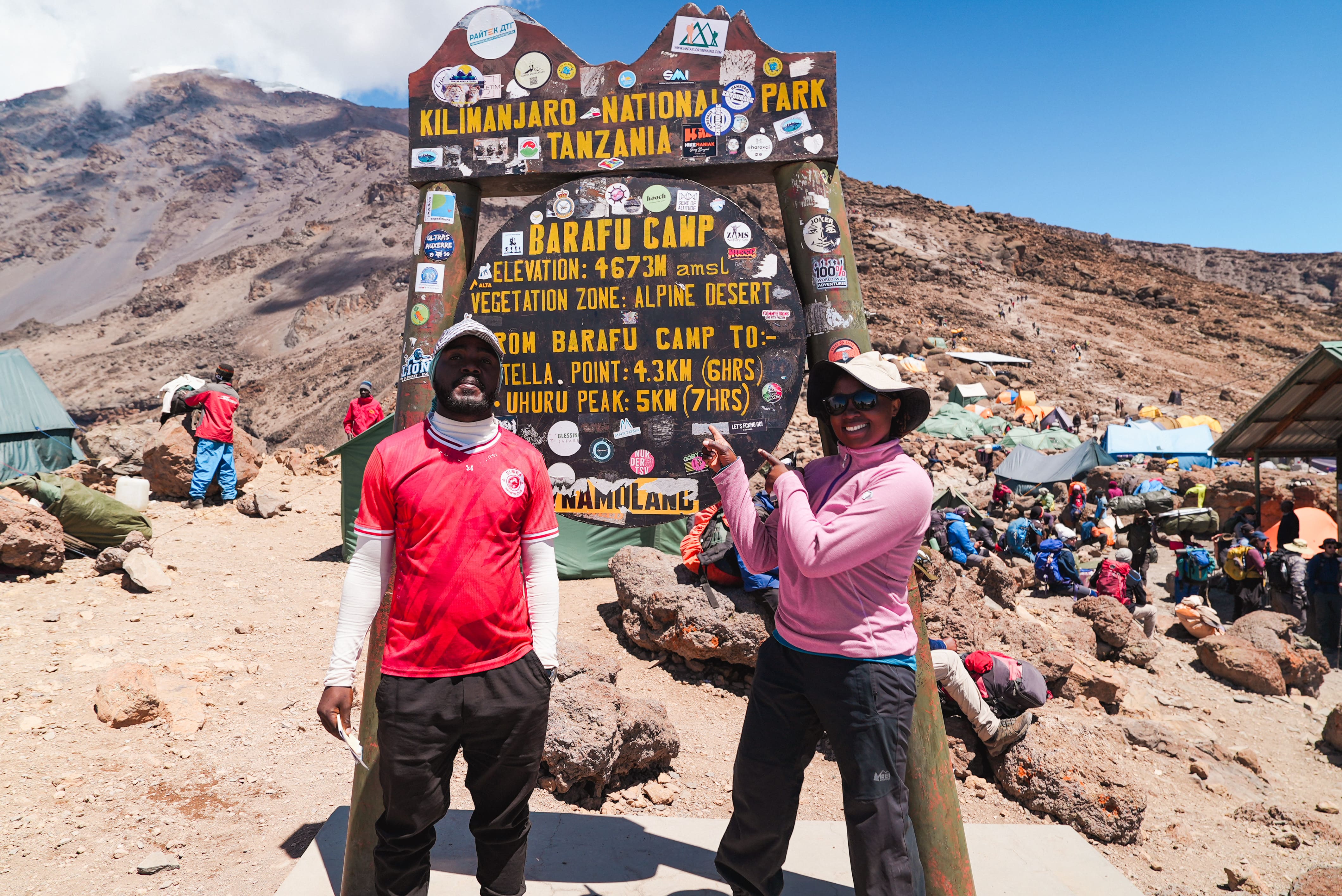 We start around midnight with headlamps, climb to Stella Point for sunrise, then continue to Uhuru Peak, the highest point in Africa. After photos and celebration, we descend back to Barafu for a meal and then continue down to a lower camp for a full night of rest.