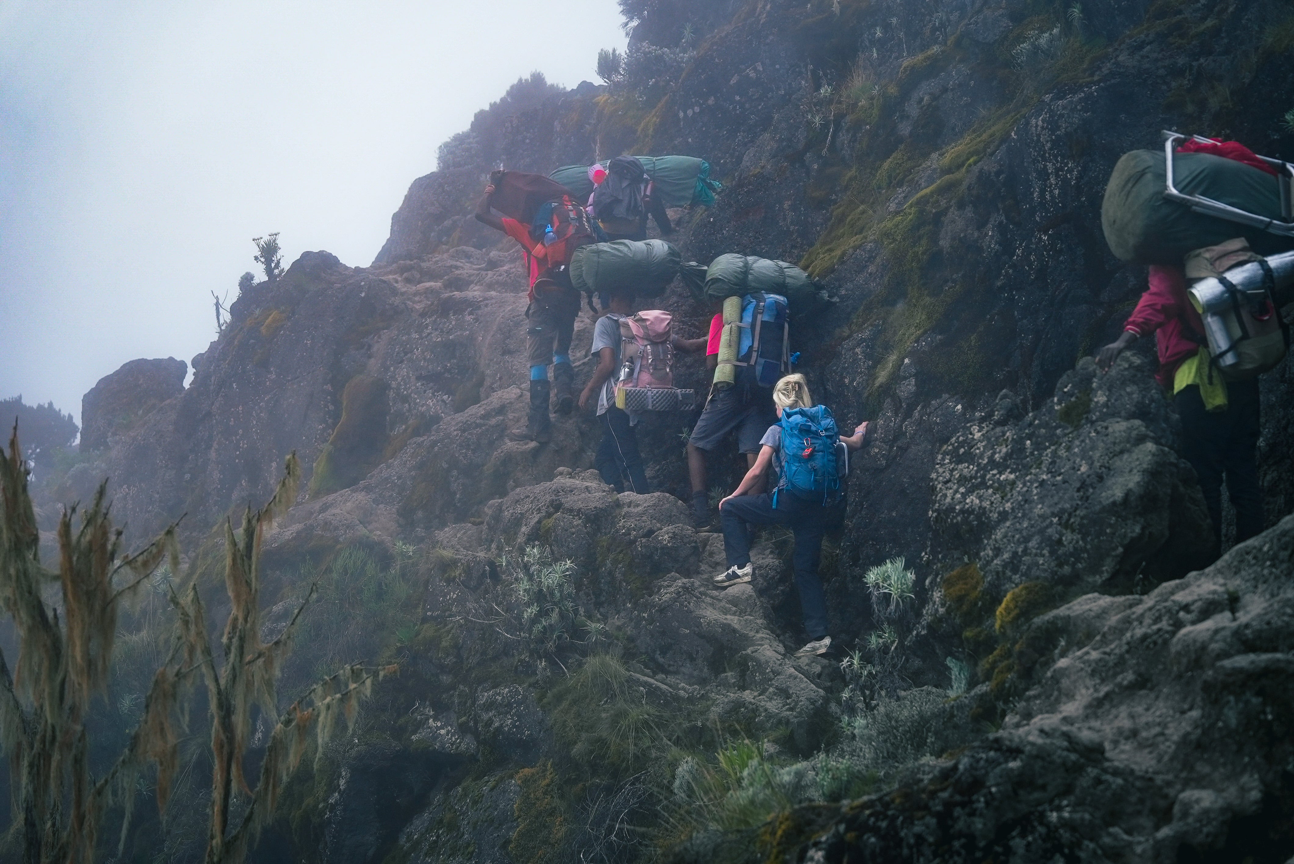 Trail: Short scramble up the Barranco Wall, traverse high valleys, then gradual climb to high camp.
